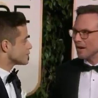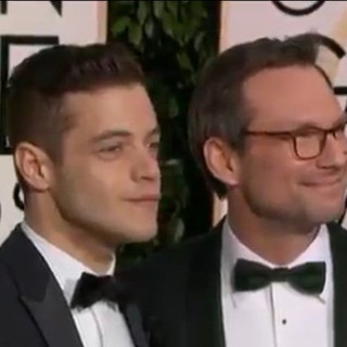 Rami Malek, Sam Esmail, Christian Slater, Carly Chaikin, Portia Doubleday e Martin Wallström no Red Carpet do 73rd Annual Golden Globe Awards realizada no Beverly Hilton Hotel em 10 de janeiro de 2016.